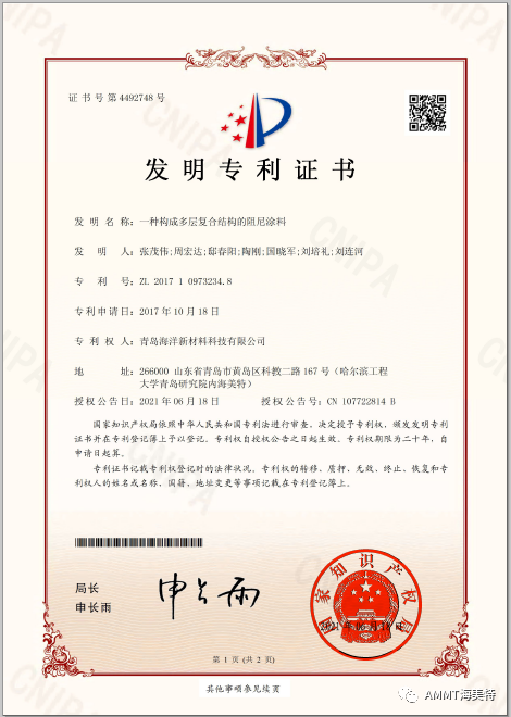 2021年6月18日,青島海洋新材料科技有限公司申請的“一種構(gòu)成多層復合結(jié)構(gòu)的阻尼涂料”發(fā)明專利獲得國家知識產(chǎn)權(quán)局授權(quán),授權(quán)專利號:ZL 2017 1 0973234.8。目前,公司共獲得國家授權(quán)專利32項,其中發(fā)明專利30項,實用新型專利1項,外觀設(shè)計專利1項。