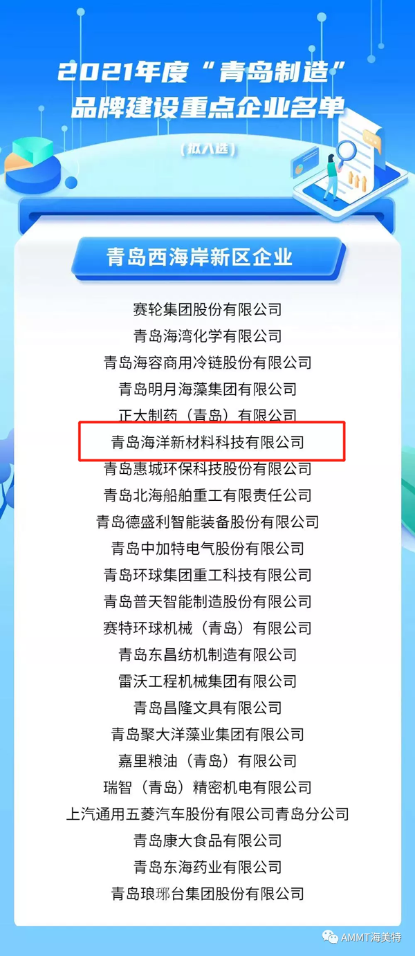 青島海洋新材料科技有限公司成功入圍市工信局組織開展的2021年度“青島制造”品牌建設重點企業名單。此次入選2021年度“青島制造”品牌建設重點企業名單共124家,其中西海岸新區入選企業23家。