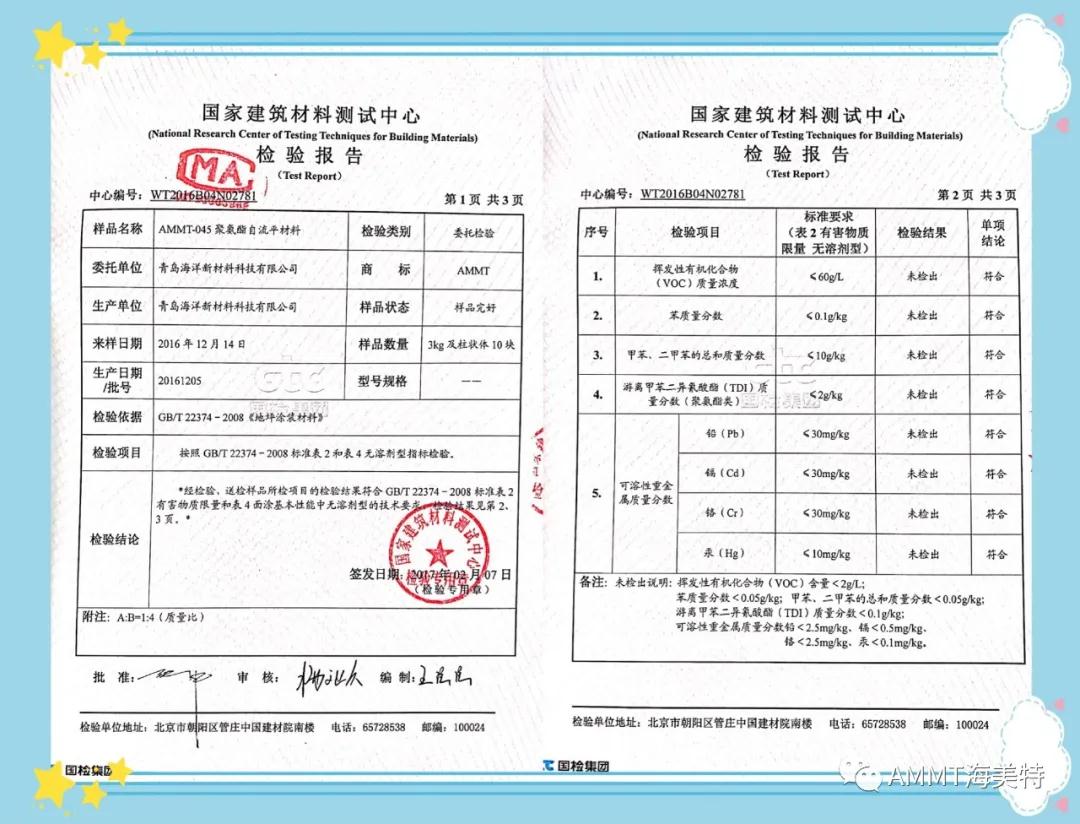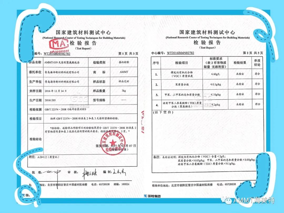 AMMT無溶劑系列產(chǎn)品由異氰酸酯預(yù)聚物、改性多元醇樹脂、擴鏈劑、填料和助劑組成的雙組份材料,綠色環(huán)保,極低VOC。目前主要產(chǎn)品有:AMMT-045無溶劑聚氨酯地坪材料(包括自流平、防靜電自流平、砂漿自流平等類型地坪材料)、AMMT-046無溶劑聚脲自流平地坪材料、AMMT-019無溶劑聚氨酯底漆、AMMT-326無溶劑環(huán)氧底漆等。AMMT無溶劑系列產(chǎn)品經(jīng)過權(quán)威機構(gòu)檢測均達到新標準環(huán)保要求。