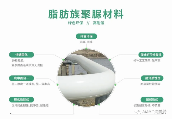 青島海洋新材料自主研發的聚脲/聚氨酯管道防腐材料在行業領域應用頗為突出,具有壽命長、綠色環保、一體成型無縫連接等性能。我公司防腐材料執行歐美國際標準,直飲水管道防腐材料通過英國WRc-NSF及山東省衛生和計劃生育委員會頒發的飲用水認證證書。