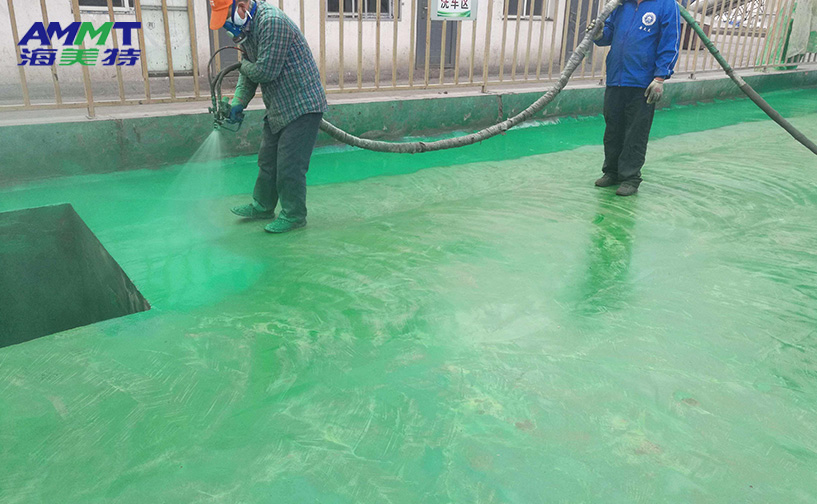 海美特自主研發(fā)的第三代噴涂聚脲彈性體材料,通過A組分改性半預聚體與B組分端氨基聚醚、胺擴鏈劑、納米填料、顏料組成,現(xiàn)場噴涂成型。